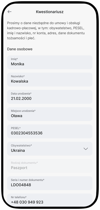 Nowy pracownik dodany do aplikacji, jeżeli wcześniej tego nie zrobił, musi wypełnić kwestionariusz, dzięki któremu administracja staje się prosta.
