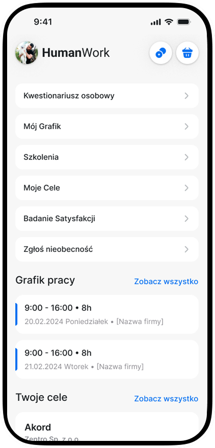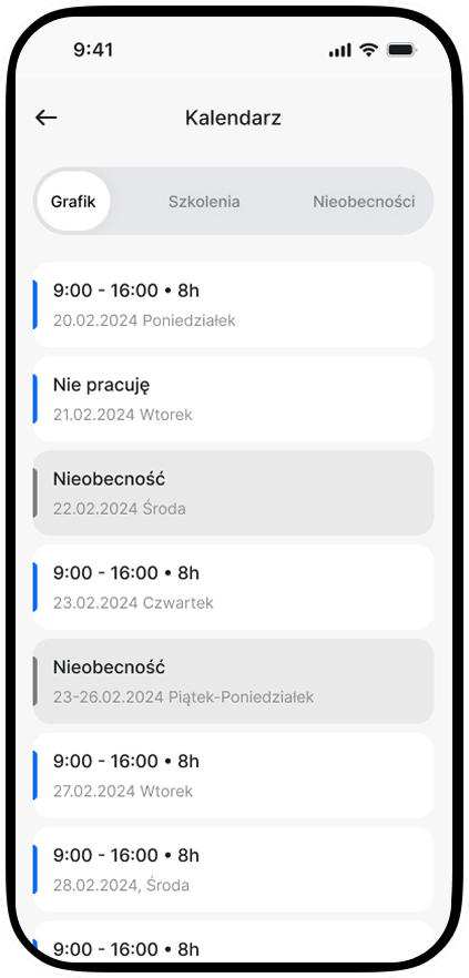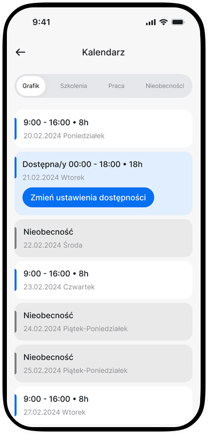 Przełożony w aplikacji udostępnia grafik pracy, rozdziela obowiązki i planuje spotkania. Wszystko w jednym miejscu – bez kartek, maili i telefonów.