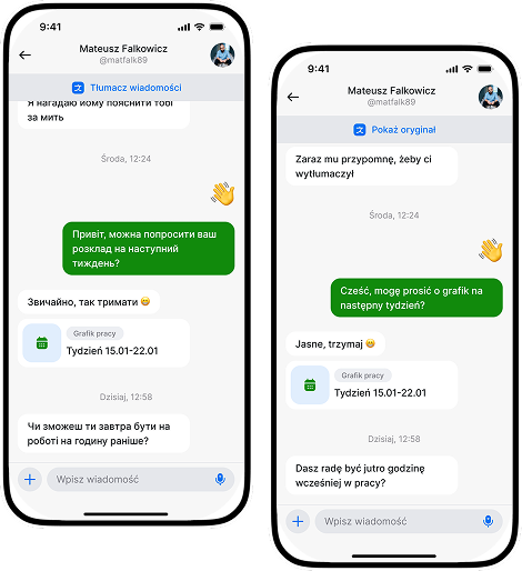 Wielojęzyczne zespoły? Żaden problem. Human Work umożliwia rozmowy z automatycznym tłumaczeniem – bez barier językowych i nieporozumień.